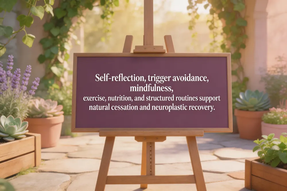 Natural cessation methods combine honest self‑reflection, trigger avoidance, and supportive routines. First, openly acknowledge the addiction and clarify why quitting matters; this personal motivation fuels change. Identify people, places, emotions that spark cravings and replace them with drug‑free relationships, hobbies, and volunteer work. Daily stress‑reduction practices—mindfulness meditation, yoga, deep‑breathing—along with regular aerobic exercise, balanced nutrition, adequate sleep, and hydration help stabilize mood and ease withdrawal discomfort. A structured routine that includes purposeful activities fills the void left by substance use.