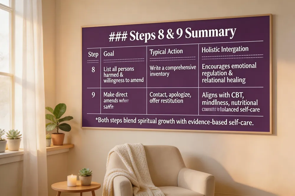 Step 8 calls for making a comprehensive list of every person we have harmed and cultivating a sincere willingness to make amends. This honest self‑examination aligns with holistic self‑care principles, encouraging emotional regulation and relational healing.