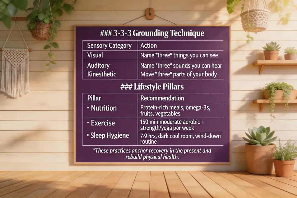 Nutrition, exercise, and sleep hygiene A balanced diet rich in protein, omega‑3s, fruits, and vegetables supplies the nutrients needed for brain repair and mood stability. Regular physical activity—150 minutes of moderate aerobic exercise per week, complemented by strength training or yoga—boosts endorphins, improves sleep quality, and diminishes stress. Prioritizing consistent sleep hygiene (7‑9 hours, a dark, cool room, and a wind‑down routine) restores circadian rhythm, enhances cognitive function, and makes cravings easier to resist. Together, these lifestyle pillars create a resilient, whole‑person foundation for lasting sobriety.