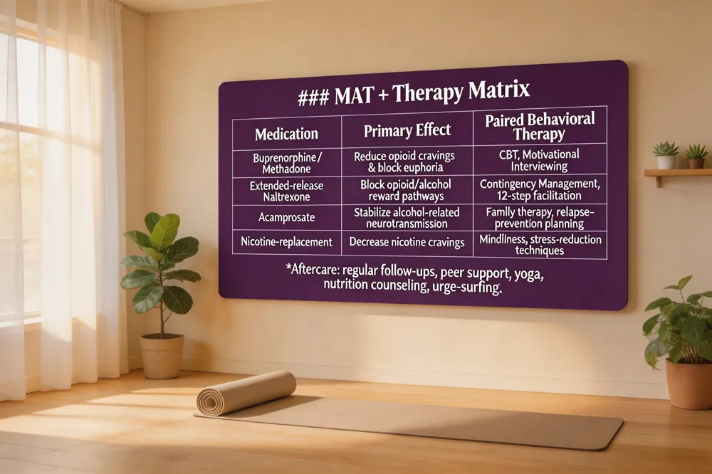 Medication‑assisted treatment (MAT) is the cornerstone of modern addiction care. FDA‑approved medications such as buprenorphine, methadone, extended‑release naltrexone, acamprosate, and nicotine‑replacement products directly reduce cravings and block the euphoric effects of opioids, alcohol, or nicotine, making relapse less likely. When these medicines are paired with evidence‑based behavioral therapies—cognitive‑behavioral therapy (CBT), motivational interviewing, contingency management, family therapy, or 12‑step facilitation—patients learn coping skills, process trauma, and rebuild healthy routines. The combination of MAT and counseling addresses both the neurochemical and psychological dimensions of dependence, which is why it is considered the most successful treatment for addiction. After the intensive phase, an integrative after‑care plan sustains gains: regular follow‑up appointments, peer‑support meetings, mindfulness or yoga practices, nutritional counseling, and relapse‑prevention strategies such as urge‑surfing and self‑compassion exercises. Tailoring this plan to the individual’s stage of change, co‑occurring mental‑health conditions, and personal goals ensures a patient‑centered, whole‑person approach. Continuous monitoring and flexible adjustments keep recovery on track, reflecting the chronic‑disease model advocated by NIDA and SAMHSA. Incorporating holistic elements such as yoga, meditation, and nutrition counseling further supports physical healing and emotional balance, reinforcing the biomedical foundation of MAT and counseling.