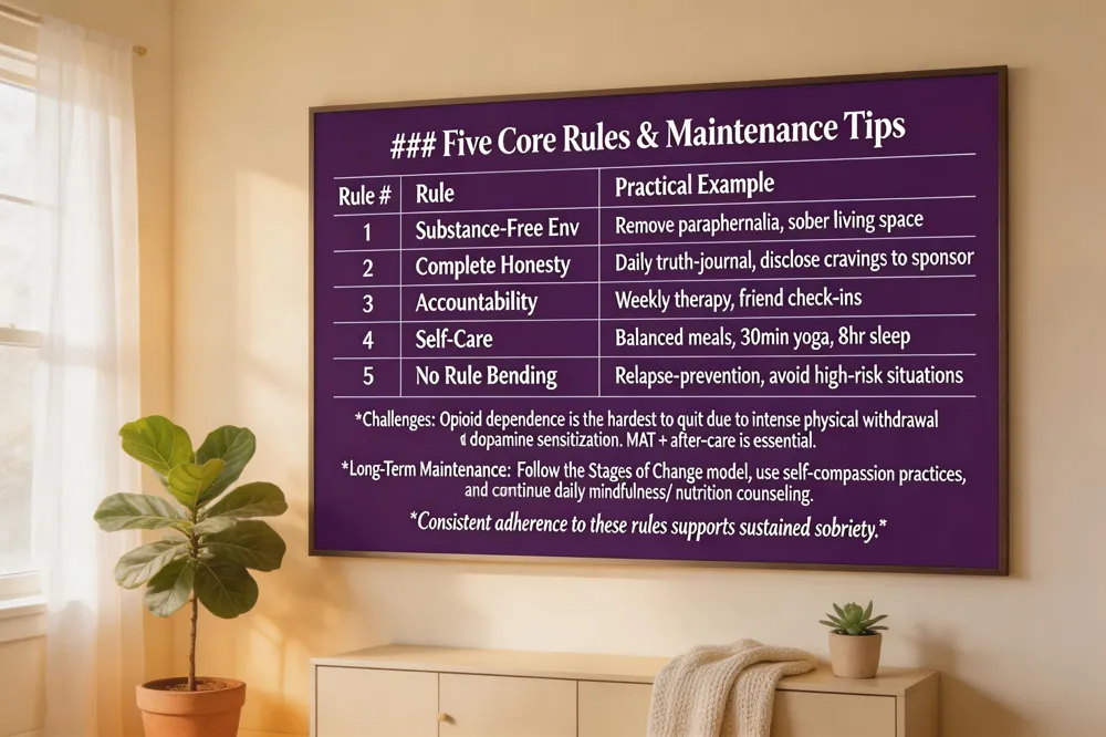 Recovery begins with five core rules that create a sturdy foundation for lasting sobriety. 1) Build a new, substance‑free environment that removes triggers and makes healthy choices easier. 2) Practice complete honesty—denial only fuels the cycle of use. 3) Seek help through professionals, support groups, and trusted loved ones to establish accountability. 4) Prioritize self‑care, nourishing body, mind, and spirit with balanced nutrition, regular exercise, mindfulness, and restorative sleep. 5) Never bend the rules; consistency protects you from slipping back into old patterns.
