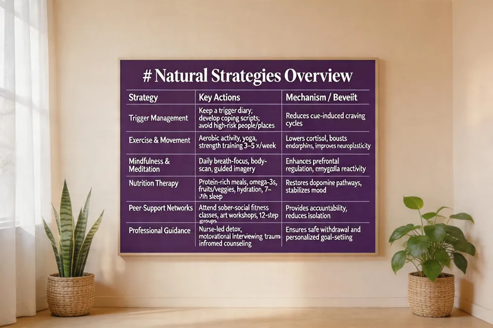 | Stopping drug addiction naturally begins with self‑recognition and professional guidance for a safe detox. A nurse‑led or medically supervised withdrawal ensures physical stability while motivational interviewing helps you explore ambivalence and set personal recovery goals. Identify and avoid personal triggers—people, places, or stressors that spark cravings—by keeping a trigger diary and developing coping scripts. Holistic lifestyle changes support brain healing: regular aerobic exercise, yoga, and mindfulness meditation lower cortisol, boost endorphins, and improve emotional regulation. Nutrition therapy restores depleted nutrients; a diet rich in protein, omega-3s, fruits, and vegetables, paired with adequate hydration and 7‑9 hours of sleep, stabilizes dopamine pathways. Build a drug‑free network through peer‑support groups, family counseling, and community activities such as sober‑social fitness classes or art workshops. These connections provide accountability, reduce isolation, and reinforce the compassionate, whole‑person approach that underpins lasting recovery. |