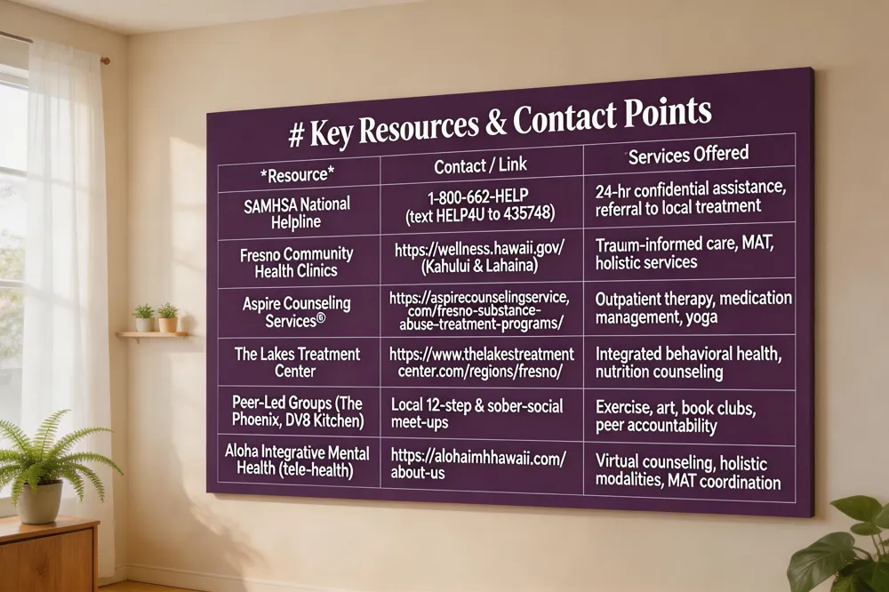 | When addiction feels overwhelming, reaching out for help can be a lifesaving first step. The SAMHSA National Helpline (1‑800‑662‑HELP) offers free, confidential, 24‑hour assistance in English and Spanish, and its text‑messaging service HELP4U (text your zip code to 435748) quickly connects callers to nearby treatment and support resources. In California’s Central Valley, Fresno’s community health clinics—including the Certified Community Behavioral Health Clinics at Maui County (Kahului and Lahaina) and local outpatient programs such as Aspire Counseling Services® and The Lakes Treatment Center—provide trauma‑informed, non‑judgmental care that blends medication‑assisted therapy with holistic services like yoga, nutrition counseling, and mindfulness. Peer‑led recovery networks, such as The Phoenix, DV8 Kitchen, and local 12‑step groups, create sober‑social environments where individuals can exercise, practice yoga, or join book clubs, fostering connection and reducing isolation. For those unable to attend in‑person sessions, telehealth platforms from providers like Aloha Integrative Mental Health and SAMHSA’s online counseling extend compassionate, evidence‑based treatment to rural and underserved populations, ensuring that personalized, whole‑person care is always within reach. |