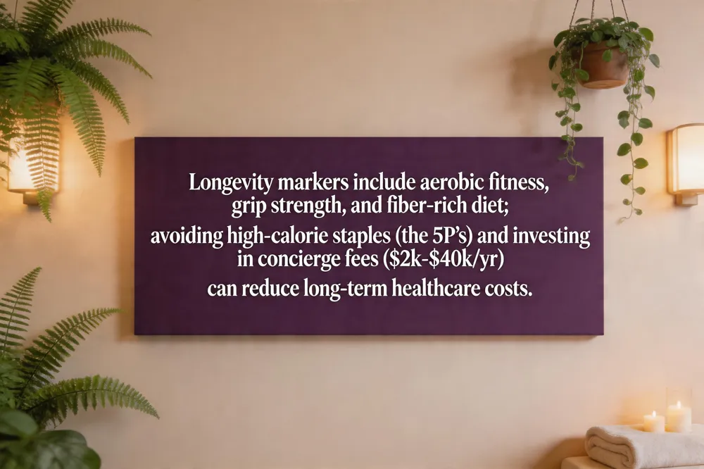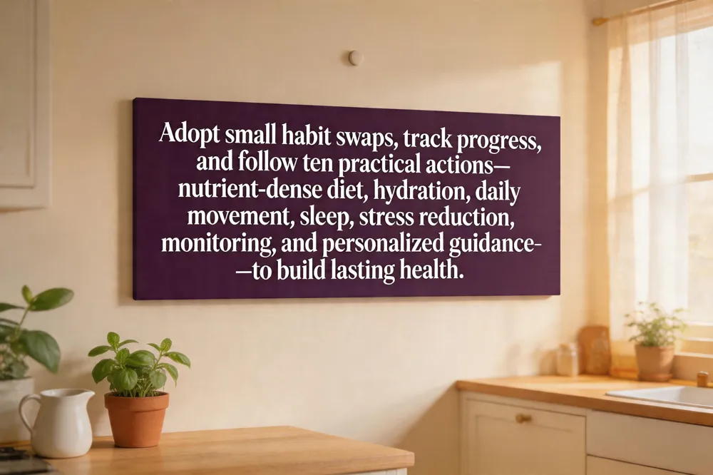 Ten practical actions: (1) Eat a nutrient‑dense, plant‑rich diet; (2) Stay well‑hydrated; (3) Move daily with aerobic, strength, and flexibility work; (4) Prioritize 7‑9 hours of sleep and stress‑reduction; (5) Monitor weight, blood pressure, cholesterol, and schedule regular check‑ups; (6) Limit alcohol and tobacco; (7) Use wearable devices for continuous vital tracking; (8) Engage in social connection; (9) Incorporate mindfulness or meditation; (10) Seek personalized guidance from a concierge physician who can coordinate labs, nutrition, and lifestyle coaching.