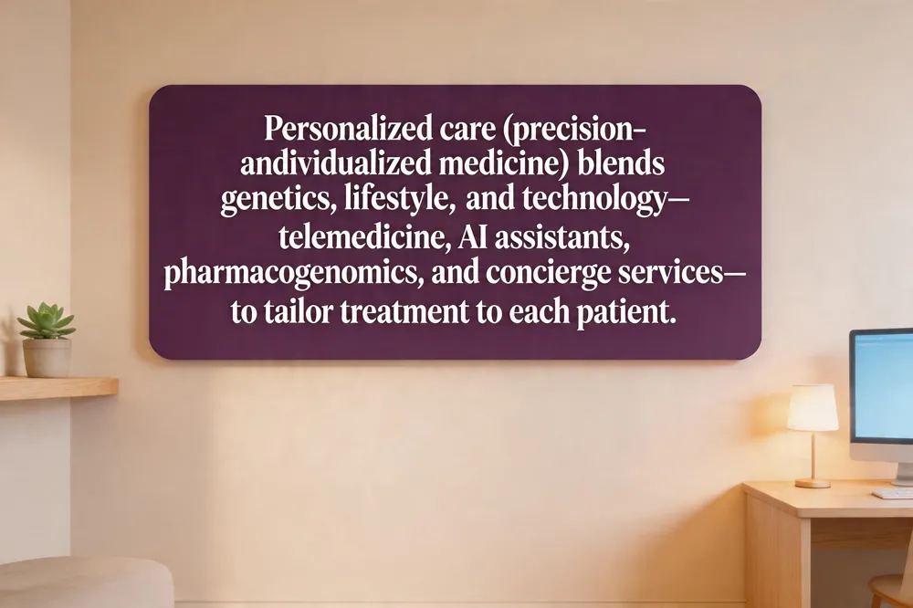 Personalized healthcare examples Live‑video telemedicine (Doctor on Demand), AI assistants (Your.MD), pharmacogenomic testing (GeneSight), and concierge services that coordinate non‑clinical needs illustrate real‑world, individualized care.