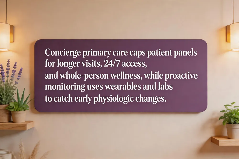 Concierge primary care is a membership‑based model in which patients pay an annual or monthly fee for on‑demand, personalized service. Physicians limit panels to as few as 50 families (MD²) or 300‑600 patients (NCIMW) so visits can last 30‑60 minutes, allowing in‑depth history, lifestyle review, and shared decision‑making. Direct 24/7 access via phone, text, email, or secure portals enables rapid response to emerging concerns and coordinated referrals. Doctors adopt this model to escape fee‑for‑service pressure, reduce burnout, and focus on whole‑person wellness, integrating nutrition, stress‑reduction, and integrative therapies. Critics note that high fees create a two‑tier system, potentially widening disparities and diverting resources from traditional practices. Proactive monitoring—continuous collection of vitals, wearable data, and lab trends—flags early physiologic changes, supporting timely interventions. Proactive Health exemplifies this approach, using at‑home biometric devices and clinical alerts to keep chronic‑condition patients out of the hospital while collaborating with insurers and care teams.