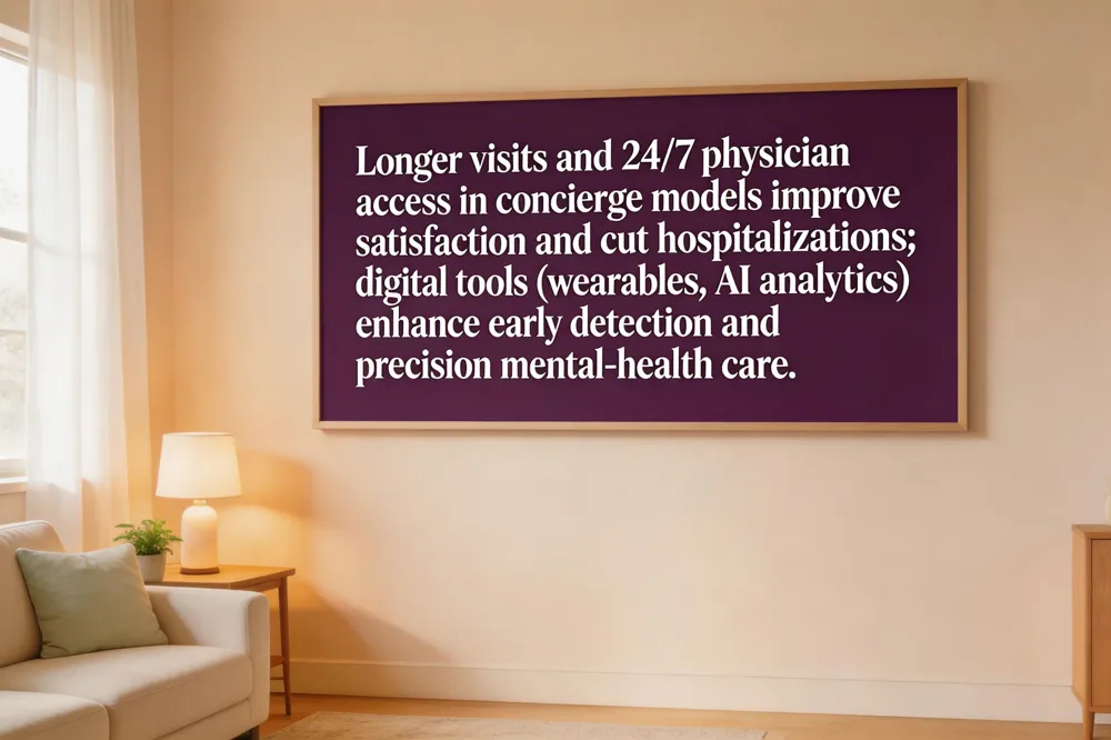 Higher satisfaction scores and reduced hospitalizations are consistently reported in concierge models, where longer, unhurried visits and 24/7 physician access enable proactive disease management. Preventive care and early detection thrive when physicians can conduct comprehensive risk assessments, schedule same‑day appointments, and order advanced screenings such as multi‑cancer blood tests. Digital health tools—wearables, remote monitoring, and AI‑driven analytics—bridge personalized care and public health by feeding real‑time data into predictive models that flag early disease signals and guide interventions. Precision mental‑health care leverages brain imaging, genetics, and machine‑learning algorithms to match patients with the most effective therapies, reducing trial‑and‑error prescribing and improving outcomes. Integrative programs like Personalized Health Partners, Cedars‑Sinai’s Integrative Medicine, and the promise of precise mental health illustrate how holistic, patient‑centered strategies, supported by digital innovations, elevate satisfaction, adherence, and overall health.