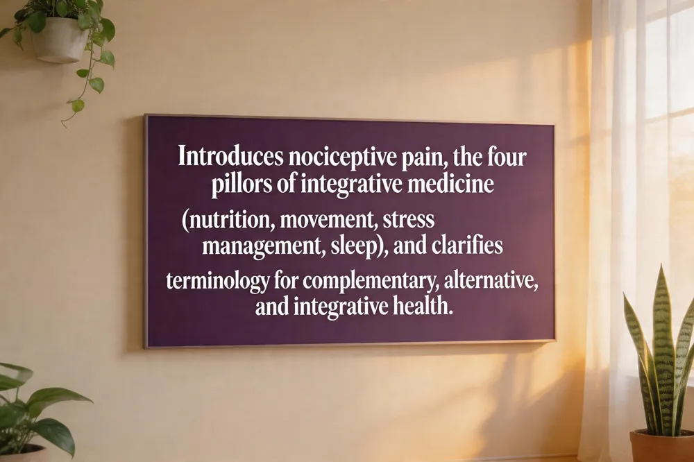 Integrative medicine rests on four pillars that together support healing: 1) Nutrition – individualized, anti‑inflammatory diets that supply essential nutrients; 2) Physical activity – regular movement to preserve strength, flexibility, and metabolic balance; 3) Stress management – mindfulness, meditation, and breathing techniques that lower cortisol and blunt pain amplification; and 4) Sleep – restorative rest that enables cellular repair and immune regulation.