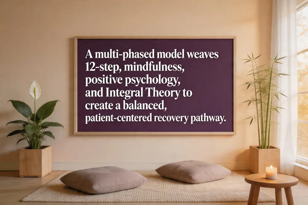 The integrated model of addiction combines 12‑step abstinence principles, mindfulness‑based interventions, positive psychology, and Integral Theory into a multi‑phased, multidisciplinary framework that balances spiritual, psychological, and physiological treatment components. 12‑step programs provide a spiritual grounding that fosters accountability and community support, while mindfulness‑based interventions such as meditation, yoga, and breathwork help regulate stress hormones (cortisol) and reduce cravings by engaging the prefrontal cortex. Positive psychology techniques—goal‑setting, strengths‑based counseling, and self‑compassion exercises—increase self‑efficacy and resilience, which are linked to higher treatment retention and lower relapse rates. Integral Theory’s four quadrants (individual‑internal, individual‑external, collective‑internal, collective‑external) guide a holistic assessment that addresses mental health, physical health, social connections, and environmental factors. Together, these elements create a compassionate, patient‑centered care plan that integrates evidence‑based medication‑assisted treatment with holistic therapies, ensuring that each person’s unique history, trauma, and strengths shape the recovery journey.