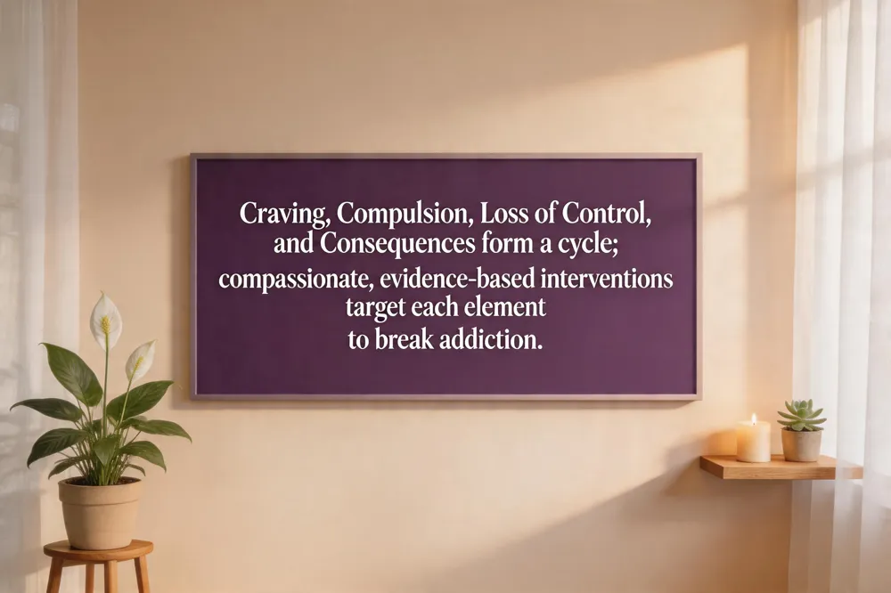 Consequences are the physical, emotional, social, and legal harms that persist despite awareness. Compassionate, holistic treatment—integrating mindfulness, yoga, nutrition, and peer support—reduces stigma, improves quality‑of‑life scores, and supports long‑term recovery. Together, these four elements illustrate the core cycle of addiction and underscore why patient‑centered, empathetic care is essential for breaking it.