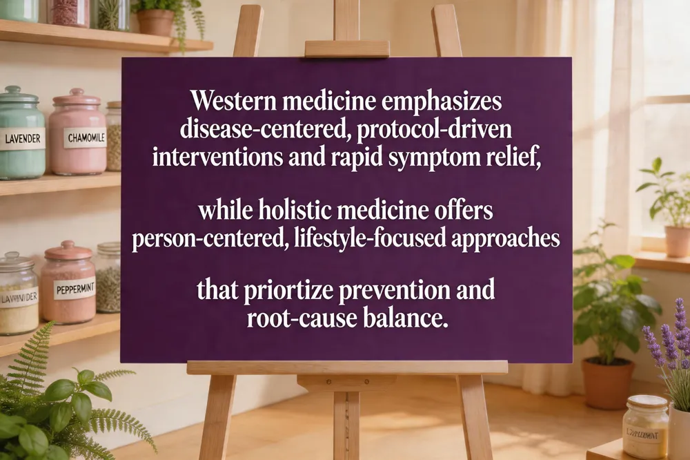 Western (allopathic) medicine concentrates on diagnosing specific diseases and treating organ‑system pathology with pharmaceuticals, surgery, and standardized tests. Holistic medicine treats the whole person—body, mind, emotions, and spirit—using individualized nutrition, lifestyle changes, and mind‑body practices.