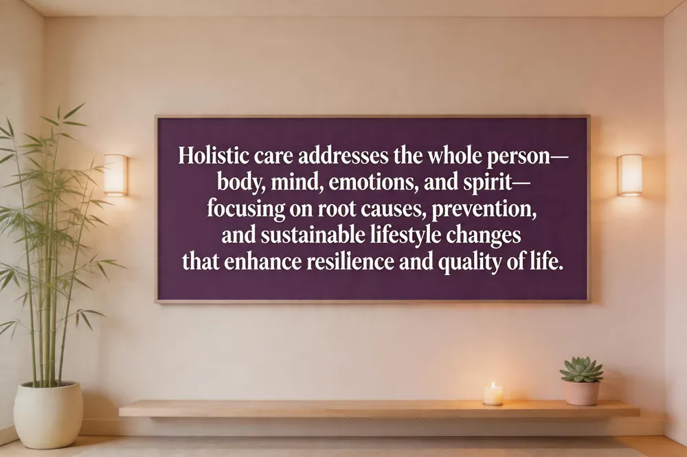 A holistic approach in medicine treats the individual as an integrated whole—body, mind, spirit and emotions—rather than isolated symptoms. It blends conventional treatments with lifestyle changes, nutrition, stress‑management and mind‑body practices (e.g., meditation, yoga, acupuncture) to restore balance and address root causes. Care is delivered through collaborative, patient‑centered teams that may include integrative physicians, osteopathic doctors, naturopaths and other complementary therapists.
