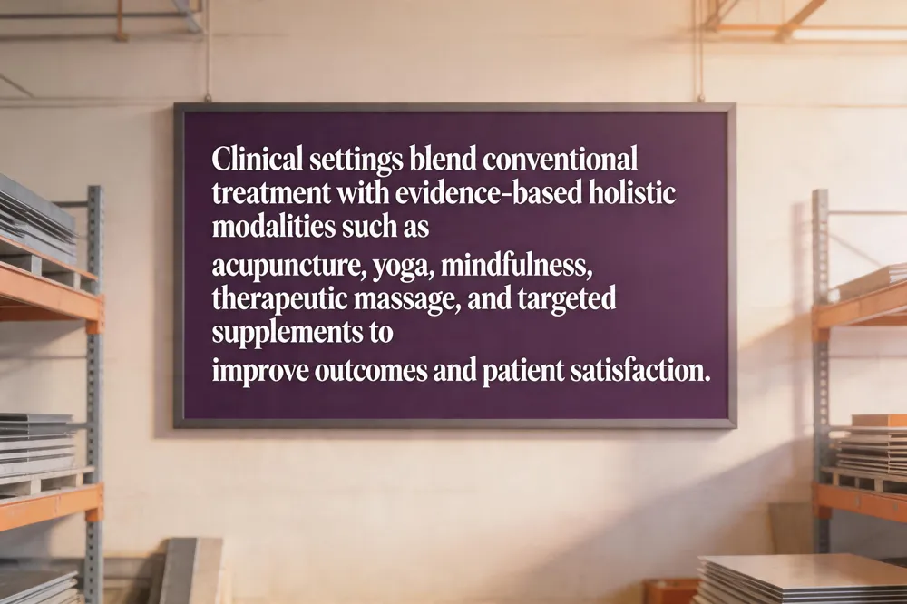 Integrative health clinics routinely blend conventional medicine with evidence‑based holistic therapies to address the whole person. Examples of holistic therapies include acupuncture for chemotherapy‑induced nausea, Yoga and tai chi to improve balance and blood pressure, mindfulness‑based stress reduction (MBSR) that lowers cortisol, therapeutic massage for pain relief, and herbal medicine such as curcumin to curb inflammation. Other modalities—energy‑based Reiki, art and music therapy, and probiotic supplementation—are also incorporated when supported by safety data.