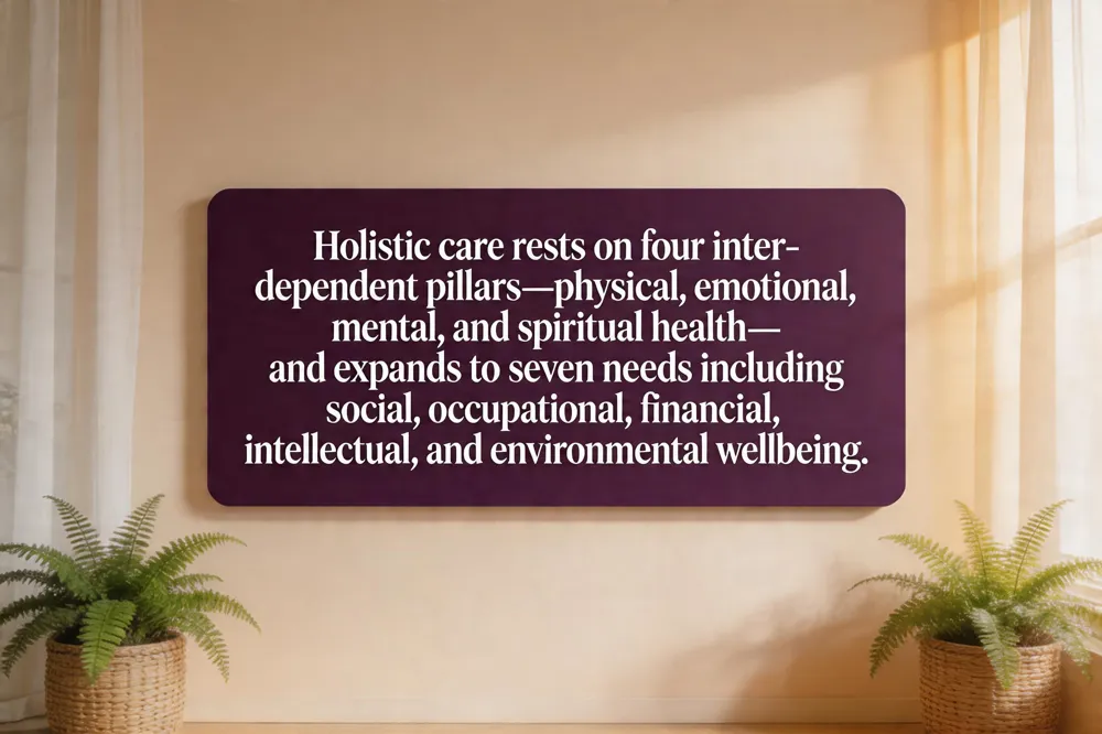 Holistic care rests on four inter‑dependent pillars: physical, emotional, mental, and spiritual health. Physical care includes nutrition, exercise, sleep, preventive screenings and safe medication use; emotional care nurtures relationships, stress‑management, and feelings of safety and belonging; mental care supports cognition, coping skills and mindfulness; spiritual care connects individuals to purpose, values and meaning, completing a balanced whole‑person approach.