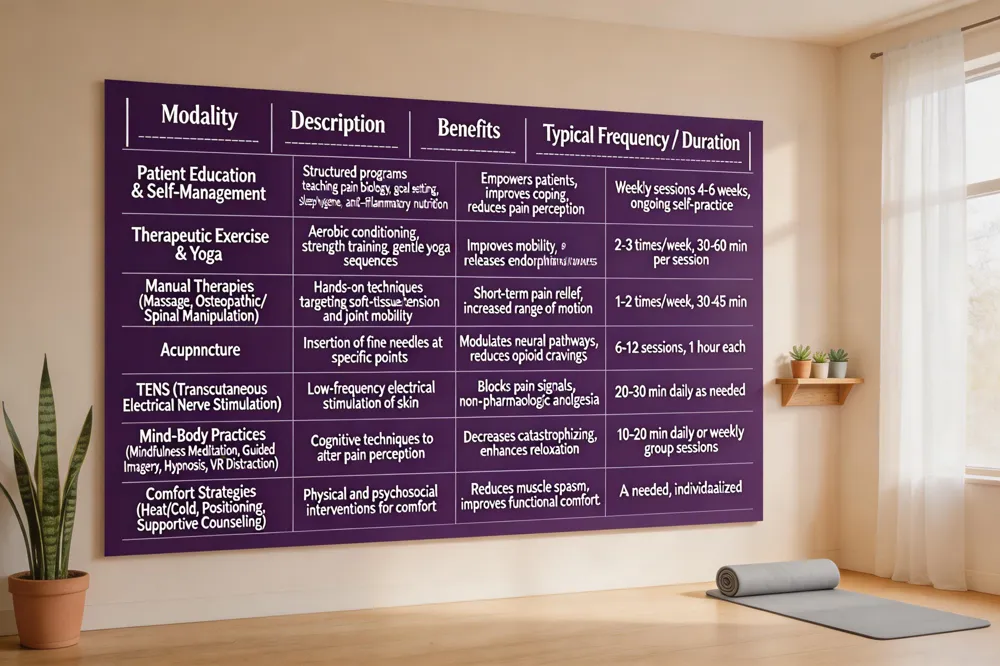 Integrative pain care begins with education and self‑management, empowering patients to understand the biology of pain, set realistic goals, and adopt healthy habits such as sleep hygiene and anti‑inflammatory nutrition. Exercise and yoga are core components; structured aerobic conditioning, strength training, and gentle yoga sequences improve mobility, release endorphins, and lower pain scores within weeks. Manual therapies—massage, osteopathic/spinal manipulation, acupuncture, and TENS—target soft‑tissue tension and neural pathways, providing short‑term relief without serious adverse events. Mind‑body practices, including mindfulness meditation, guided imagery, hypnosis, and virtual‑reality distraction, modulate central pain processing and reduce catastrophizing. Comfort strategies such as heat or cold application, optimal positioning, and supportive counseling round out the regimen, enhancing relaxation and functional comfort.