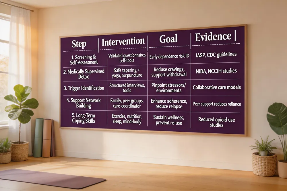 We start with honest self‑assessment tools and professional screening to help you recognize early signs of dependence, a step supported by the IASP definition of integrative care and CDC recommendations for non‑pharmacologic monitoring. If dependence is identified, we arrange medically supervised detox that combines safe medication tapering with evidence‑based therapies such as acupuncture, yoga, and mindfulness‑based stress reduction, which have been shown to lower opioid cravings and support withdrawal (NIDA, NCCIH). Next, we work together to pinpoint personal triggers—stress, certain environments, or social cues—using structured interviews and validated questionnaires. You will then develop a supportive network that includes family, peer groups, and a care‑coordinator, echoing findings that collaborative models improve satisfaction and reduce medication reliance. Finally, we equip you with long‑term coping skills: regular exercise, anti‑inflammatory nutrition, sleep hygiene, and mind‑body practices that sustain wellness and keep drug use from returning.