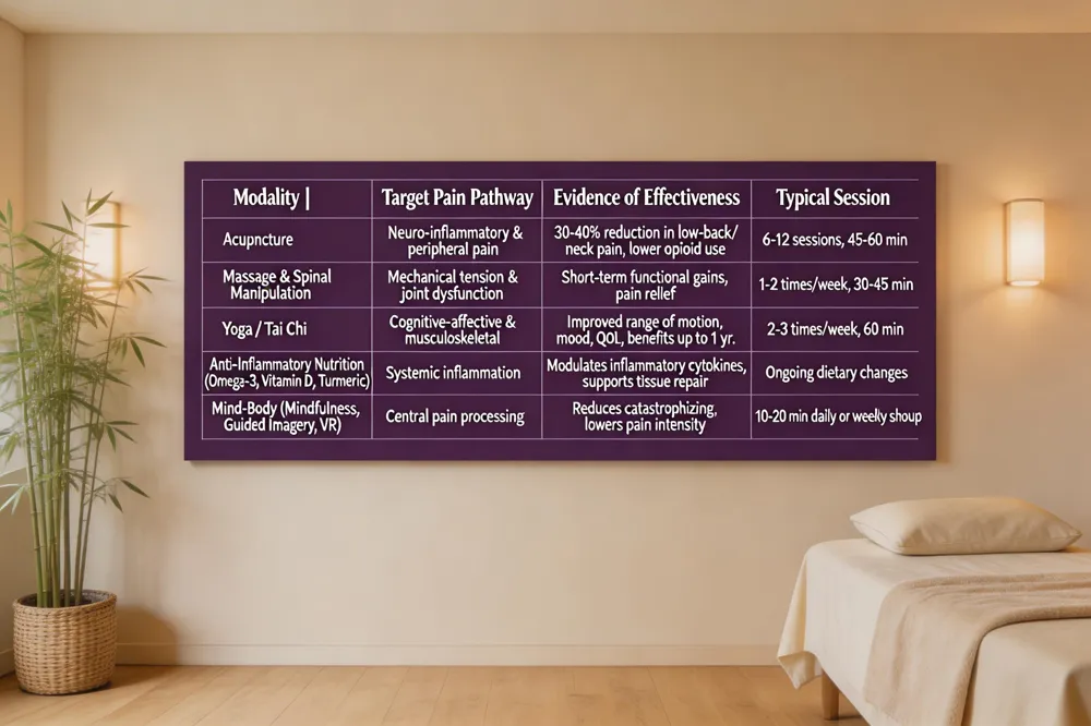 Integrated pain care blends conventional medicine with complementary therapies to treat chronic pain as a biopsychosocial condition. A multimodal framework coordinates physicians, physical therapists, acupuncturists, yoga instructors, and mental‑health specialists so that each modality targets a different pain pathway—mechanical, neuro‑inflammatory, and cognitive‑affective. Robust evidence shows acupuncture reduces low‑back and neck pain scores by 30‑40% and can lower opioid requirements, while systematic reviews confirm short‑term functional gains and pain relief from massage and spinal manipulation. Yoga and tai chi improve range of motion, mood, and quality of life, with benefits persisting for at least one year in randomized trials. Anti‑inflammatory dietary strategies—omega‑3 fatty acids, antioxidants, vitamin D, and turmeric modulate systemic inflammation and support tissue repair, further decreasing medication reliance. Patient‑centered planning tailors these interventions to individual preferences, comorbidities, and social determinants, fostering active participation, education, and sustained functional improvement.