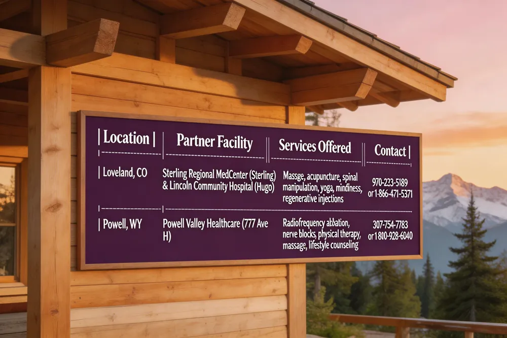 Holistic Pain Management (HPM) brings evidence‑based integrative therapies—massage, acupuncture, spinal manipulation, yoga, mindfulness and regenerative injections to rural Colorado and Wyoming. In Loveland, CO, HPM does not have a dedicated clinic but partners with Sterling Regional MedCenter (Sterling) and Lincoln Community Hospital (Hugo) to deliver short‑wait, personalized pain‑relief plans. Residents call 970‑233‑5189 or 1‑866‑471‑5371 to be routed to the nearest partner site. In Powell, WY, HPM collaborates with Powell Valley Healthcare at 777 Avenue H, offering radiofrequency ablation, nerve blocks, physical therapy, massage and lifestyle counseling during extended weekday hours (7 AM‑7 PM). Appointments are booked by calling 307‑754‑7783 or the nurse line 1‑800‑928‑6040. Both locations emphasize a biopsychosocial model, combining conventional medicine with mind‑body techniques to lower opioid use and improve function. Community access is enhanced through coordinated referrals, tele‑health options and a patient‑centered care team that tailors treatment to each individual’s needs and long‑term health.