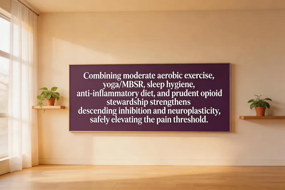 A higher pain threshold is achievable when the body and brain are trained together. Regular, moderate‑intensity aerobic exercise (about 150 minutes per week) drives exercise‑induced neuroplasticity: it strengthens descending inhibitory pathways, promotes axonal sprouting, and releases endorphins that dampen nociceptive signals. Mind‑body practices such as yoga, mindfulness‑based stress reduction, and deep‑breathing further reframe pain by teaching the nervous system to interpret sensations as non‑threatening, lowering perceived intensity and reducing catastrophizing. Sleep hygiene is equally vital—consistent, restorative sleep supports neurogenesis and stabilizes the autonomic balance, making the brain less reactive to pain cues. An anti‑inflammatory diet rich in omega‑3 fatty acids, antioxidants, fiber and lean protein reduces systemic cytokines that sensitize nociceptors, complementing the neuro‑plastic gains from movement. Finally, prudent opioid stewardship—using the lowest effective dose, tapering when possible, and pairing medication with psychotherapy or counseling—prevents opioid‑induced hyper‑sensitivity and preserves the natural pain‑modulating systems. By integrating these evidence‑based strategies, patients can safely raise their pain threshold and regain functional confidence.