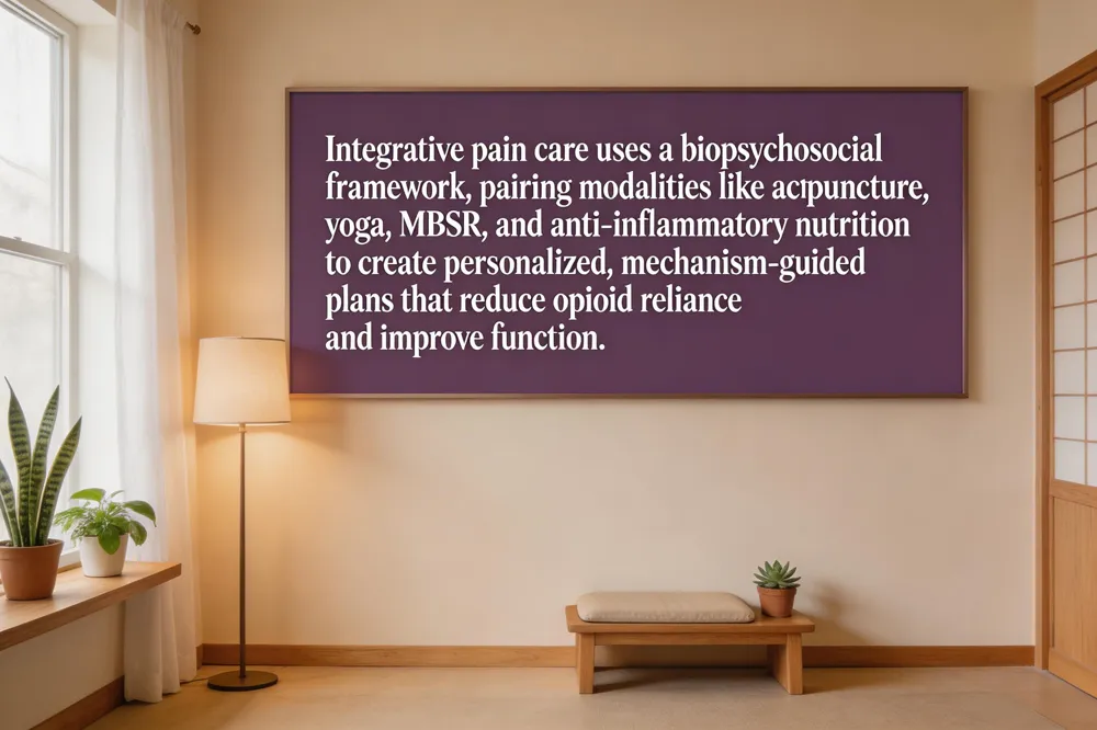 Integrative pain care is grounded in the biopsychosocial model, recognizing that chronic pain arises from the interplay of biological pathways, psychological states, and social environments. This perspective moves beyond tissue‑focused treatment, addressing inflammation, fear, mood, sleep, and social support. A growing body of high‑quality research supports complementary therapies that act on distinct mechanisms: mindfulness‑based stress reduction lowers pain intensity by ~30% and improves function; acupuncture and acupressure provide modest yet significant reductions in back, osteoarthritis and headache pain; yoga, tai chi and therapeutic massage enhance flexibility, strength and pain perception; and nutritional counseling with anti‑inflammatory foods reduces systemic markers linked to pain. When these modalities are combined with conventional medicine in a patient‑centered, mechanism‑guided plan, clinicians can tailor interventions to the individual’s specific pain drivers, reduce reliance on opioids, and foster long‑term functional recovery, overall well‑being, for sustainable health. Such a comprehensive strategy empowers patients to take active roles in their recovery journey.