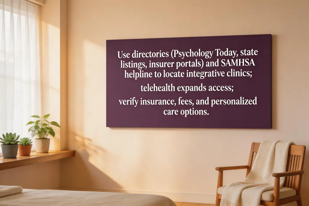 Primary‑care clinicians can start a holistic mental‑health search by using trusted provider directories such as Psychology Today, state health‑department listings, or the insurer’s online search tool. In many states, integrative clinics appear in these databases, offering combined psychotherapy, nutrition counseling, yoga, meditation, and acupuncture. Telehealth expands access—programs like the Center for Solutions and state‑run tele‑mental‑health networks deliver evidence‑based CBT, mindfulness‑based stress reduction, and medication management via video across rural and urban areas. The SAMHSA National Helpline (1‑800‑662‑HELP) provides 24/7, confidential referrals to local integrative resources, support groups, and crisis services, and its text service (HELP4U, 435748) can locate nearby options by zip code. Sample regional programs include the DBT Center of Wyoming (in‑person DBT, EMDR, equine therapy, and statewide telehealth), Behavioral Health Services at Campbell County Health (sliding‑scale counseling, group DBT, Medicaid/Medicare), and Harmony Hills in Florida, which blends conventional therapy with yoga, art, and nutrition counseling. Contact each center to verify insurance acceptance, fee structures, and the ability to tailor a personalized, whole‑person treatment plan.