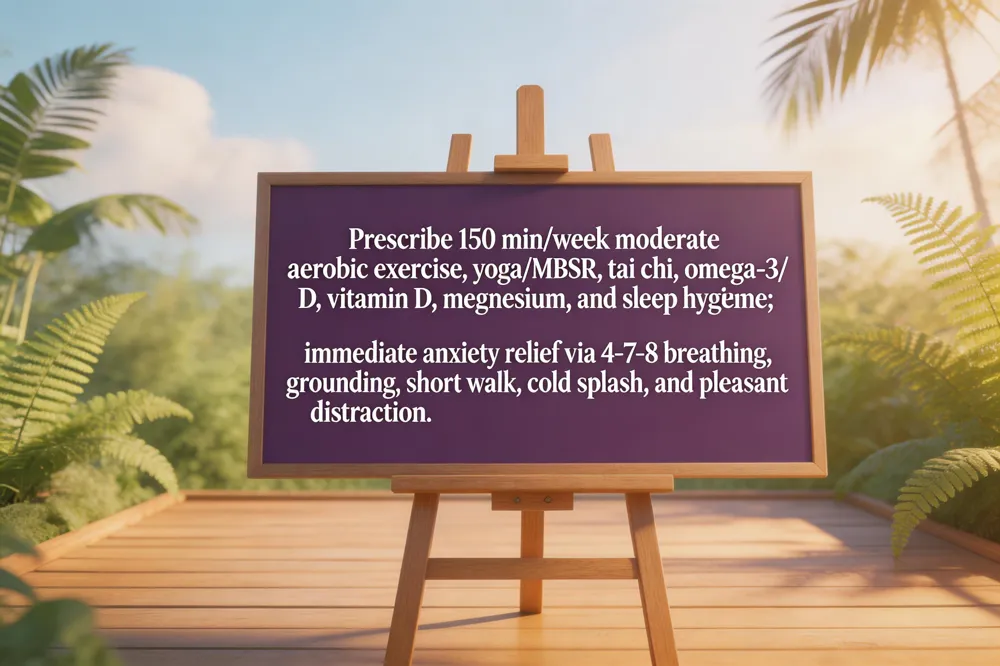 Integrative primary‑care teams blend evidence‑based psychotherapy with mind‑body practices such as yoga, mindfulness‑based stress reduction (MBSR) and tai chi, which have been shown to lower cortisol and improve mood. A prescription of 150 minutes of moderate aerobic exercise each week (brisk walking, cycling, swimming) reduces the odds of major depressive disorder by ≈ 25 % and eases anxiety. Nutrient‑dense diets rich in omega‑3 fatty acids, vitamin D and magnesium support neurotransmitter balance; supplementation (EPA/DHA ≈ 1 g/day, vitamin D 2 000‑5 000 IU, magnesium 250 mg at bedtime) yields modest symptom relief. Sleep hygiene—consistent bedtime, limiting screens, and a cool dark room—combined with stress‑reduction techniques (4‑7‑8 breathing, progressive muscle relaxation, grounding 5‑4‑3‑2‑1) offers rapid anxiety relief.