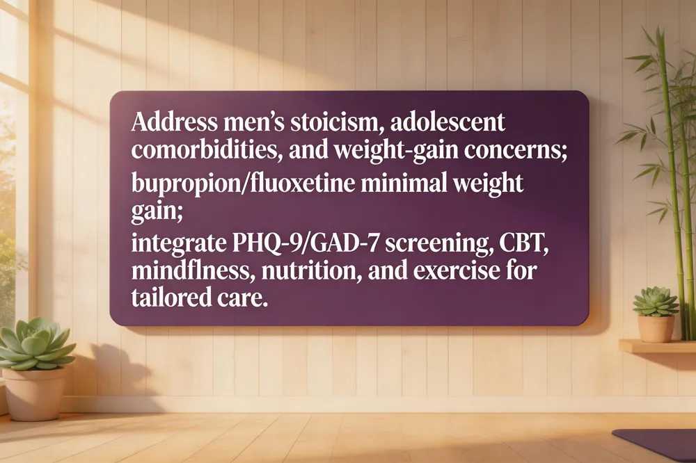 Men’s mental‑health barriers – Cultural expectations of stoicism often cause men to hide depressive symptoms, expressing them instead as irritability, substance use, or over‑working. Routine, non‑judgmental screening (PHQ‑9 and GAD‑7) and open‑ended conversations can break down these barriers. Integrative tools such as (**mindfulness‑based stress reduction (MBSR) and yoga practices, and supportive community groups encourage men to share feelings and receive personalized care.