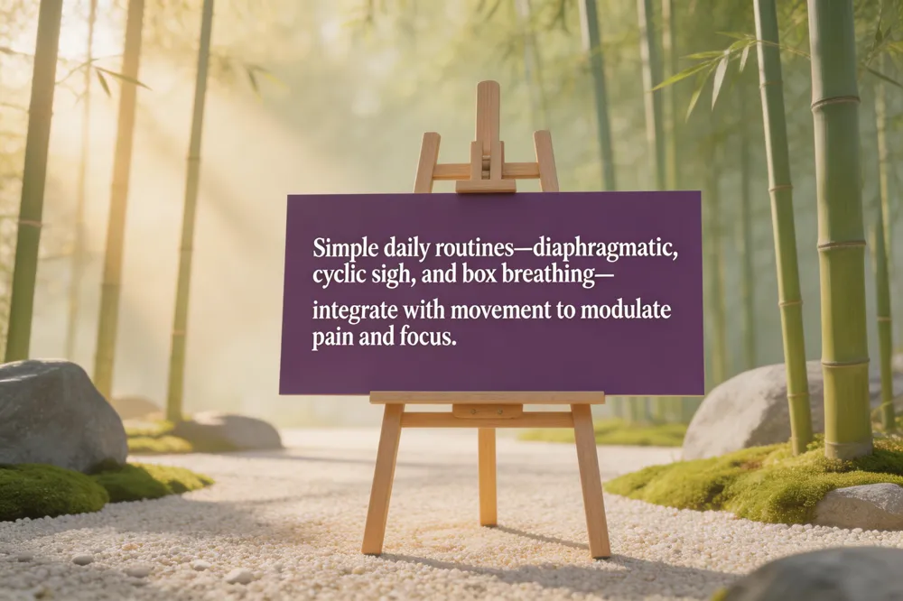 Simple daily breath routines (5‑10 min) – Begin each session with 5 minutes of diaphragmatic breathing: inhale through the nose for 4 seconds, expand the belly, hold 2 seconds, then exhale slowly for 6 seconds. Repeat, then add a 2‑minute cyclic sigh (double inhale, long exhale) to lower respiratory rate and cortisol.