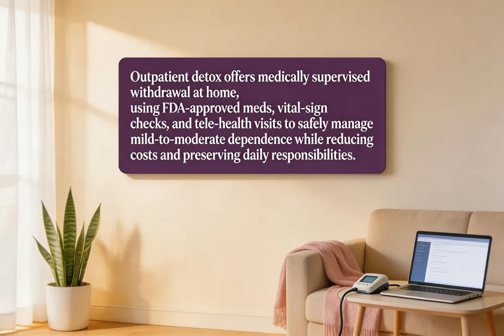 Outpatient detox is a medically supervised program that lets individuals manage withdrawal while staying at home. After a comprehensive assessment, a personalized plan is created that includes FDA‑approved medications such as buprenorphine for opioids or benzodiazepines for alcohol, regular vital‑sign checks, and scheduled clinic or tele‑health visits. This safety net minimizes severe complications like seizures or delirium tremens and allows rapid escalation to inpatient care if needed. The Substance Abuse and Mental Health Services Administration (SAMHSA) endorses outpatient detox as an evidence‑based option for patients with mild‑to‑moderate withdrawal severity who have a stable, substance‑free environment and reliable support. Because patients avoid overnight hospitalization, costs are substantially lower—averaging $1,200‑$3,500 versus $5,000‑$20,000 for residential stays—while still meeting national safety standards, as shown by Joint Commission accreditation at many centers.