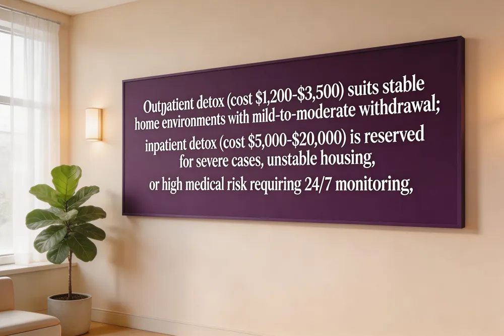 Cost differs sharply: Outpatient detox costs $1,200‑$3,500 for a medically supervised course, whereas inpatient stays can cost $5,000‑$20,000 because of round‑the‑clock staffing and room‑and‑board expenses.