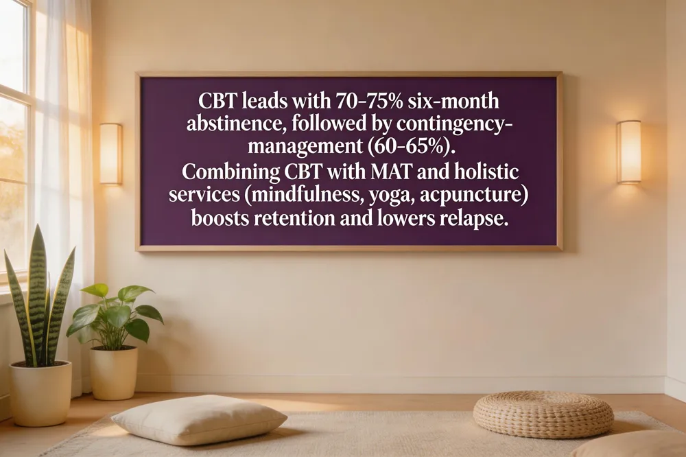 Outpatient detox and intensive programs rely on evidence‑based therapies to turn relapse into lasting change. Cognitive‑behavioral therapy (CBT) consistently yields the highest success, with 70‑75 % of participants staying abstinent at six months. Contingency‑management, rewarding clean‑urine tests, follows closely at 60‑65 % success, while other approaches such as dialectical‑behavior therapy and motivational interviewing add 55‑60 % benefits. When CBT is paired with medication‑assisted treatment—buprenorphine for opioids, benzodiazepines for alcohol—withdrawal symptoms lessen and cravings drop, creating a stable foundation for recovery. Holistic wellness services—mindfulness meditation, yoga, nutrition counseling, acupuncture—address mind‑body balance and reduce anxiety, reinforcing therapeutic gains. Patients who integrate these elements report higher satisfaction and lower relapse risk.