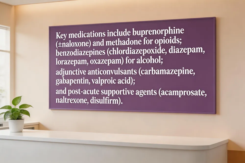 Medical detox typically employs a range of prescription medications to ease withdrawal and prevent complications. For opioid use disorder, methadone and buprenorphine (often combined with naloxone) are the standard agents that reduce cravings and lessen withdrawal intensity. Alcohol detox commonly uses benzodiazepines such as chlordiazepoxide (Librium), diazepam (Valium), lorazepam (Ativan), or oxazepam, as well as anticonvulsants like carbamazepine, gabapentin, valproic acid, and vigabatrin to prevent seizures and curb cravings. Benzodiazepine dependence may also be managed with a taper of the same class of drugs, while phenobarbital is an alternative for both alcohol and benzodiazepine withdrawal in some settings. Supportive medications such as acamprosate, disulfiram, and naltrexone are often introduced after the acute detox phase to aid long‑term abstinence.