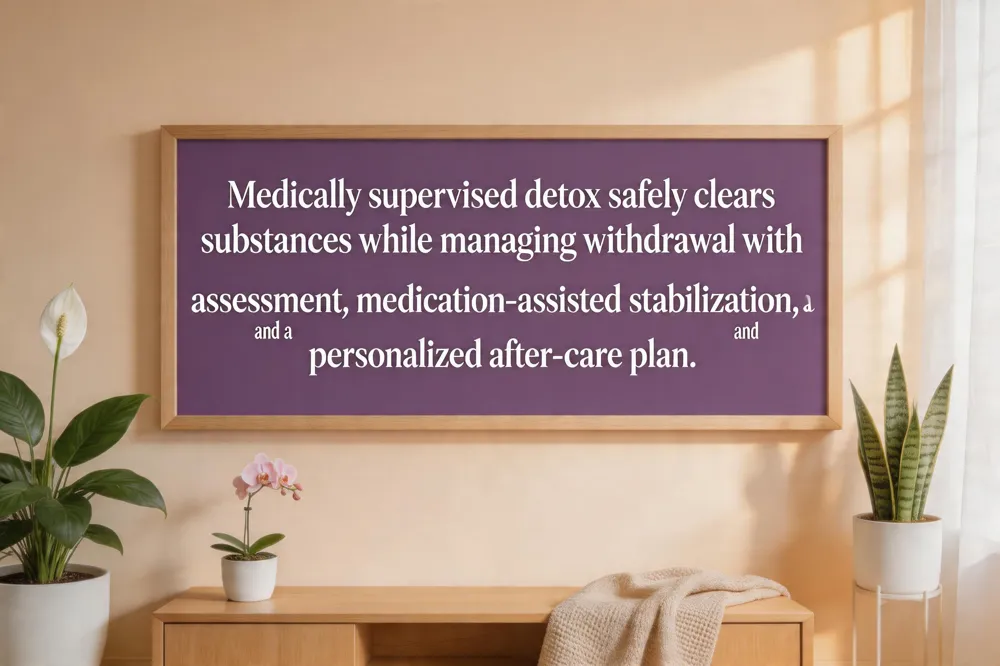 Detox treatment is a medically supervised process that safely clears drugs or alcohol from the body while managing withdrawal symptoms.[Medical supervision] and comprehensive assessment – The first step is a thorough evaluation of physical health, mental health, substance‑use history, and living environment. Clinicians use this assessment to determine the appropriate level of care—outpatient for mild‑to‑moderate withdrawal with a stable home, or inpatient for severe dependence, co‑occurring medical conditions, or an unsafe environment.
