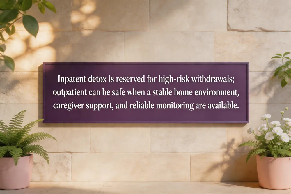 Detox does not have to be inpatient; many qualified provide outpatient options that let patients stay at home while receiving medical supervision, counseling, and medication‑assisted treatment. Inpatient detox is recommended when withdrawal is potentially life‑threatening—such as severe alcohol, benzodiazepine, or opioid dependence, when rapid‑acting medications (e.g., benzodiazepines, buprenorphine) must be administered promptly, or when co‑occurring medical or psychiatric conditions require 24‑hour monitoring. Outpatient suitability hinges on milder withdrawal symptoms, a stable and supportive living environment, reliable transportation, and the ability to keep scheduled clinic or tele‑health visits. Safety considerations include the presence of a responsible caregiver, access to emergency services, and a clear relapse‑prevention plan. Both settings can incorporate holistic approaches—yoga, mindfulness, nutrition counseling, acupuncture—to promote overall wellness and reduce cravings. Comprehensive after‑care, including counseling, twelve‑step groups, and relapse‑prevention strategies, is essential for sustained recovery regardless of the detox level. Choosing the right setting involves a personalized assessment of substance type, withdrawal severity, co‑occurring disorders, and home support; consulting a qualified health professional or using SAMHSA’s 24/7 helpline (1‑800‑662‑HELP) can help determine the safest, most effective path forward.
