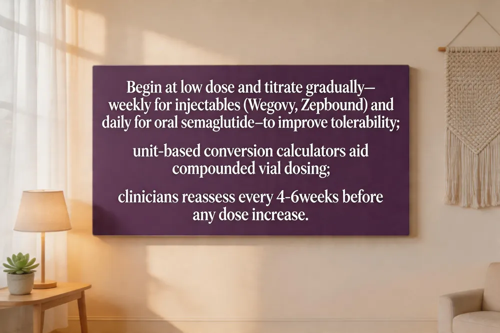A simple dosing calculator can automate the unit conversion for compounded vials. pre‑filled pens (Wegovy®, Ozempic®, Zepbound®, Mounjaro®) have fixed doses and do not require calculation. Working closely with a pharmacist, dietitian, and physician ensures the titration aligns with personal weight‑loss goals, side‑effect profile, and overall health.