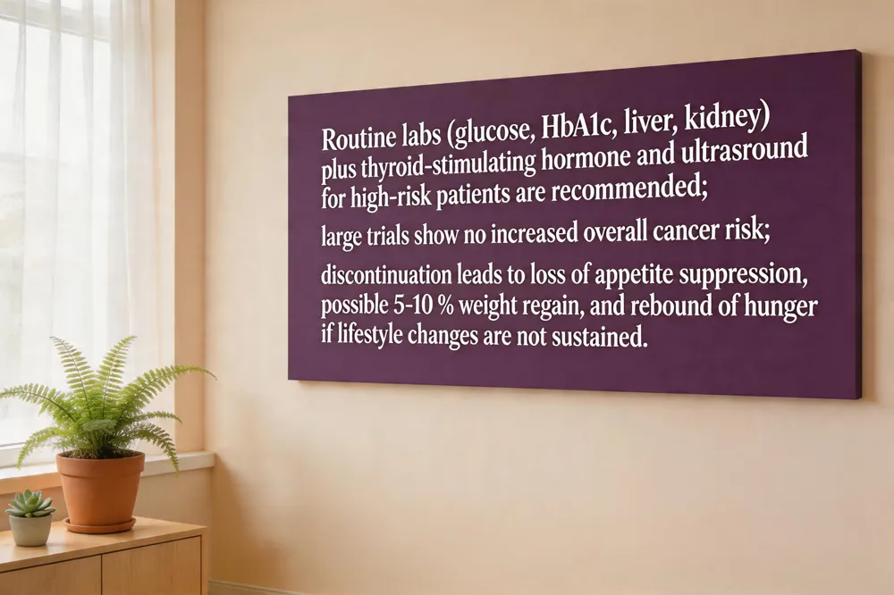 GLP‑1 receptor agonists are generally safe, but clinicians recommend regular labs and imaging to catch rare complications early. Routine blood work should include fasting glucose, HbA1c, liver enzymes, and kidney function; thyroid‑stimulating hormone and neck ultrasound are advised for patients with a personal or family history of medullary thyroid carcinoma (MTC) or MEN 2. Annual abdominal ultrasound can screen for gallbladder stones, especially in high‑dose users.