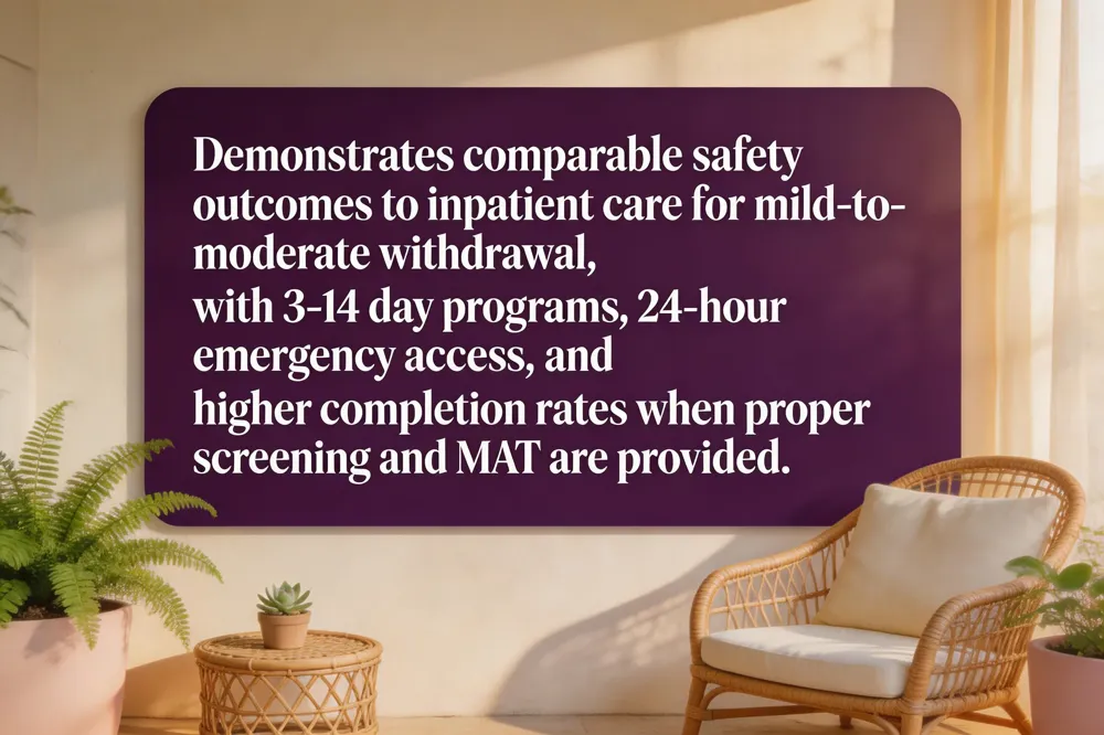 Outpatient detox is a patient‑centered option that can be just as safe and effective as inpatient care for individuals with mild‑to‑moderate withdrawal. Systematic reviews and randomized trials (e.g., NCBI, 2022) show comparable safety outcomes—no significant differences in seizures, hallucinations, or suicidality—when patients are properly screened and receive 24‑hour emergency access. The typical outpatient program lasts 3‑14 days, with most programs averaging about 6.5 days of daily or twice‑weekly visits that include vital‑sign monitoring, medication‑assisted treatment (MAT), and brief counseling sessions. Scheduling is flexible—often evenings or weekends—allowing patients to maintain work, school, or family responsibilities while receiving medical supervision.
